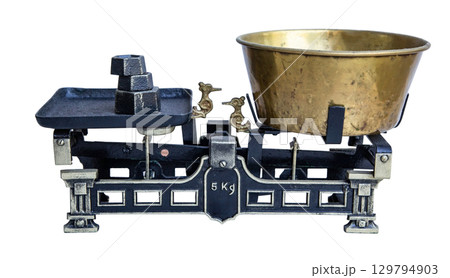 Balance scales with blue and red sphere in balance. Balls of same size and weight but of different colors in perfect balance in weighing pans of a brass scale. Symbol for justice and balance of power.