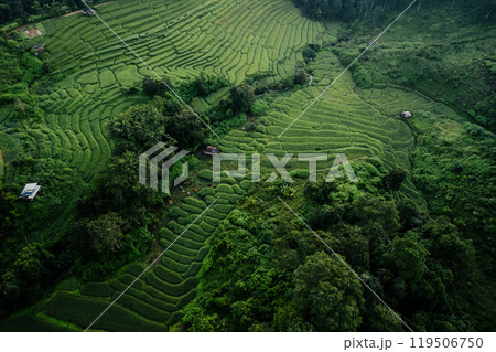 Aerial view of the rice fields,Rice fields and mountains in the early morning
