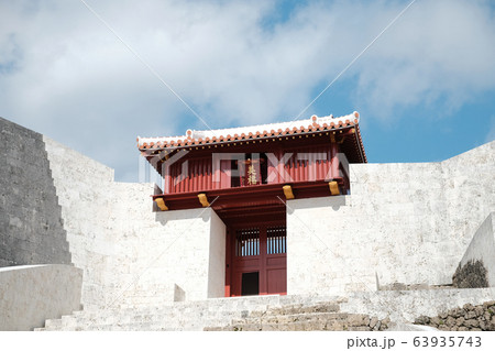 沖縄の観光地首里城公園の中の美福門と青空
