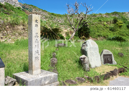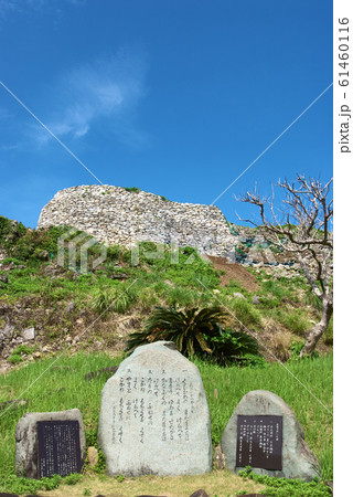 石灰岩の石垣でできた久米島の観光名所の具志川城跡の石碑