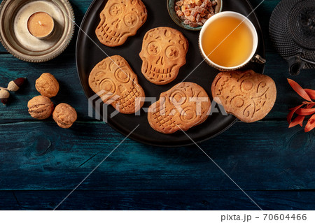 Halloween ginger cookies in the shape of skulls, homemade Dia de los muertos biscuits, shot from above witch copy space