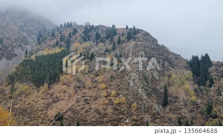 Green mountains and rocks in a foggy weather, scenic landscape with no people.