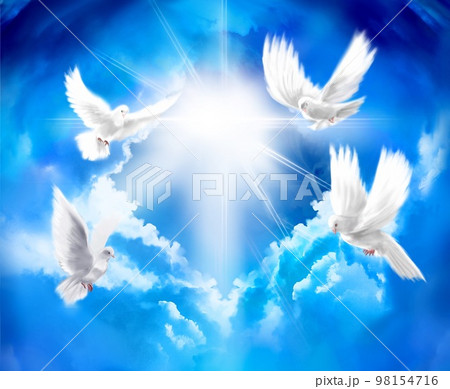平和の象徴である白い鳩が太陽の周りを飛んでいるラッキーな背景イラスト