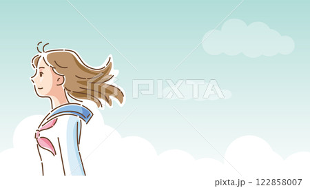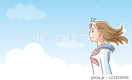 爽やかな青空をバックに前を見つめるセーラー服の女子学生の横顔