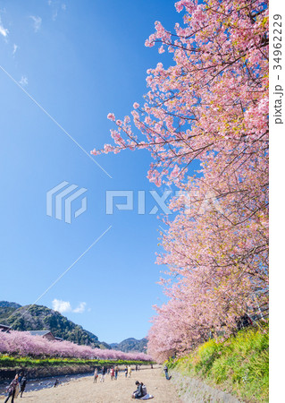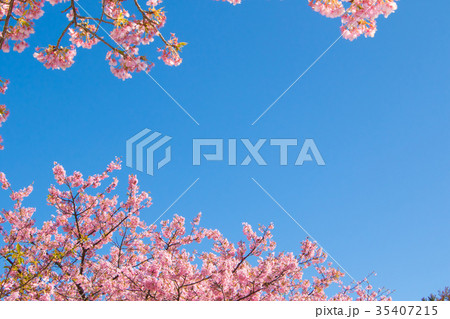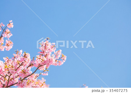 快晴の青空と河津桜 桜 早咲きの桜 伊豆 静岡 さくら サクラ 画像素材 コピースペース 背景素材