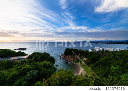 南紀白浜中秋の夕景 青空の領域が広がり水平線近くの夕焼けとのコントラストが美しい空