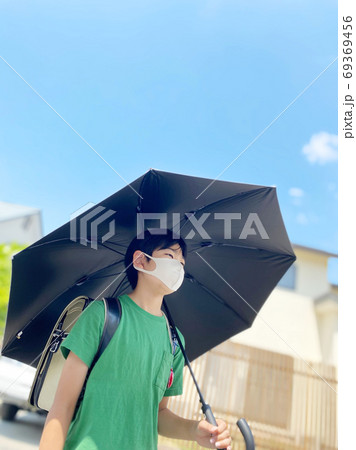 猛暑の中を日傘で歩く小学生 後ろ姿