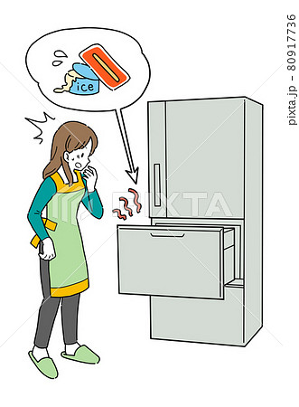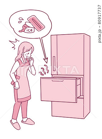 壊れた冷蔵庫とショックを受ける主婦のイラスト