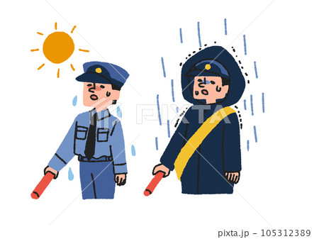 天候の悪い時も外で働く警察官または警備員のイラスト