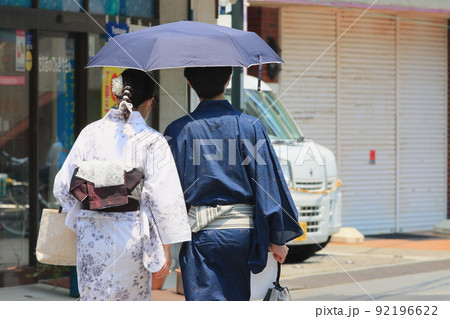 和装の男女 日傘をさして歩く男女 観光地 観光客
