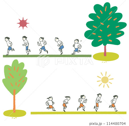 降り注ぐ日光の下ランニングする体操服の学生たちと大木 イラスト素材