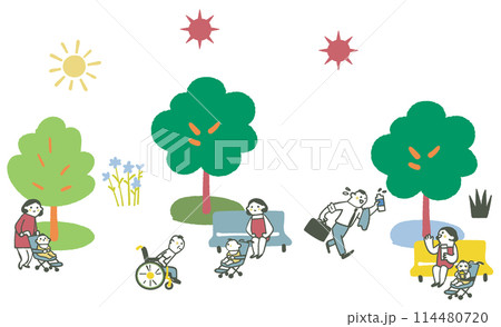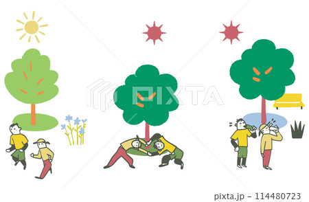 熱い夏の日大きな木の木陰でスポーツしたり散策する人々 熱中症対策 イラスト素材のセット