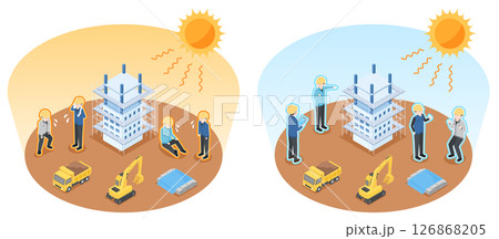 暑さで元気がない現場作業員と炎天下でも涼しげな現場作業員