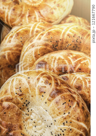 Uzbek Tajik Turkish traditional flatbreads, delicious oriental lavash bread Deliciously Freshly Baked Soft Bread Rolls with a Beautifully Golden and Crunchy Crust on Top