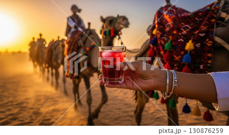 Hand holding a glass of refreshing karkade tea with a camel caravan in the desert at sunset
