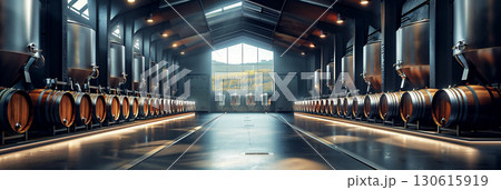 Vineyard winery interior showcasing wooden barrels and fermentation tanks, with a stunning fall landscape visible through large windows, featuring ample copy space