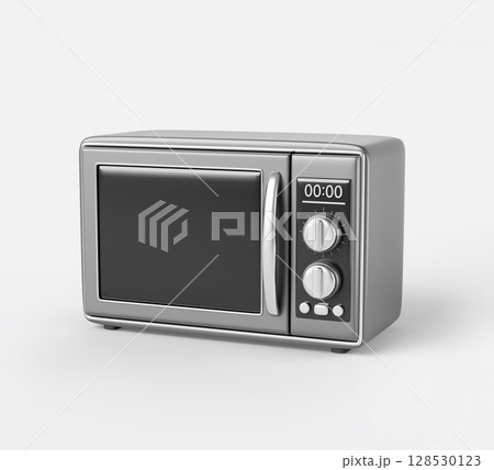 Kitchen microwave oven isolated on white background. Home appliance with digital display, buttons. Silver electrical device for quick cooking, warm, defrost food Realistic render icon. 3D illustration
