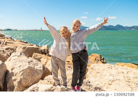 Happy children sisters posing on rocks near sea on sunny rocky coastline day with raised arms