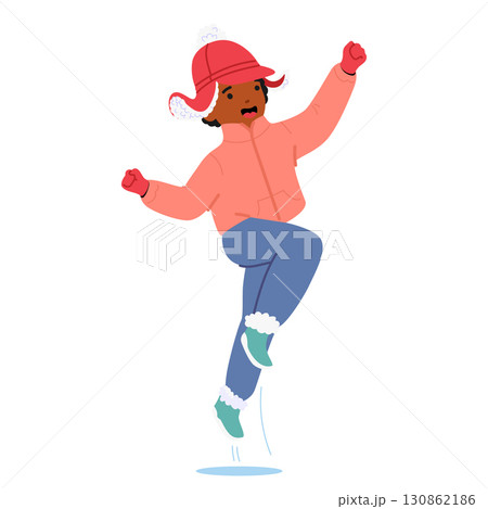 Funny boy child cartoon character wearing winter clothes and warm red hat jumping up in air