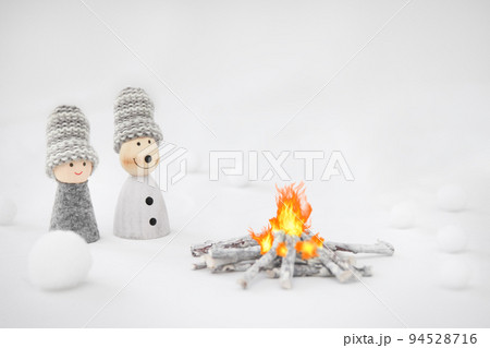 北国で暮らすかわいい小人の人形。クリスマスシーズンに焚火。新年やクリスマスのカード。