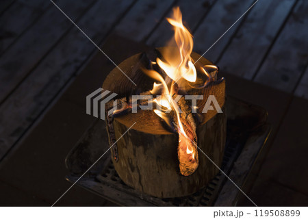 松ぼっくりで薪ストーブに着火をするイメージ 点き始め