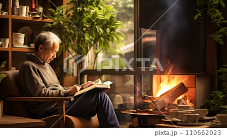 薪ストーブのある風景 燃える薪ストーブ 暖かい部屋 イメージ素材