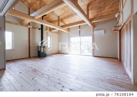 木造住宅のリビングと薪ストーブ