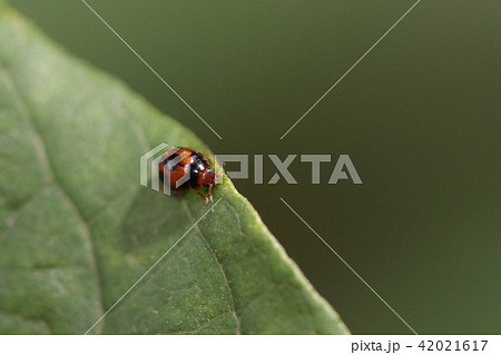 生き物 昆虫 ムツボシテントウ、前胸背板は黒。頭部はくすんだ黄褐色に見えます
