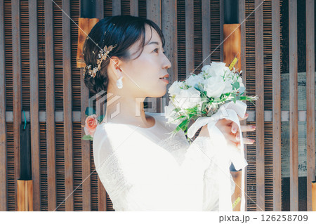 和の装飾を背景に佇むウェディングドレス姿の女性ポートレート