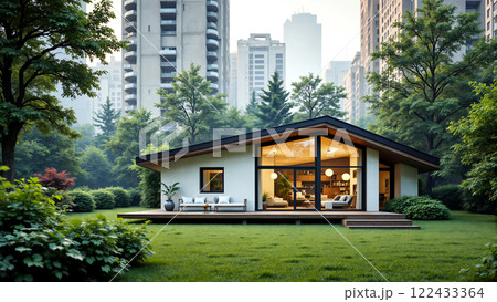 大都市に住む超富裕層のライフスタイル。広い庭のある平屋。ここに住んでいる人は大地主なのかもしれない。