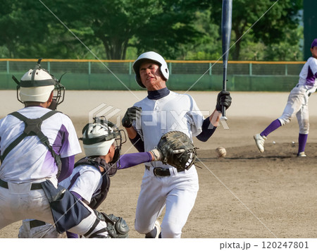 野球の試合中にピッチャーの投げた球を受けようとして体で球を止めるキャッチャー