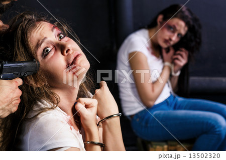 Crime. Two beautiful girls in the Business clothing kidnapped by criminals. Terrorist is threatening