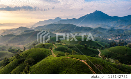 Beautiful aerial view of Long Coc tea hills. Long Coc in Phu Tho Province, Vietnam