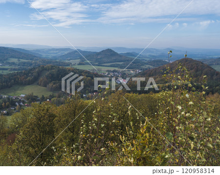 Panoramic view from viewpoint Stredni vrch near Dolni Prysk, Ceska Kamenice. Autumn landscape with colorful forest, hills and blue cloudy sky in Luzicke hory Lusatian Mountains, Czech Republic.