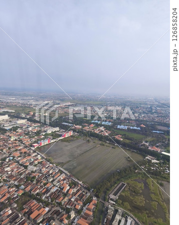 Aerial view from airplane window above green ground. View from the airplane window with beautiful clouds at sunrise. Earth and sky as seen through window of an airplane.