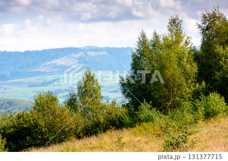 forest and grassy meadows on hills under cloudy autumnal sky. beautiful countryside in fine autumn weather. nature scenery of outskirts in carpathian mountains on a sunny day