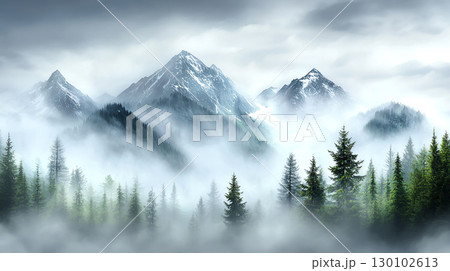 Majestic mountain slopes rise above misty forest, enveloped in moody, cloudy sky. serene landscape evokes sense of tranquility and wonder