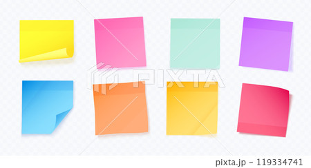 Realistic memo stickers. Colorful paper sticky reminder for office work notes organizing, post note sticker empty page business schedule notepaper set, exact vector illustration