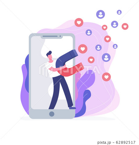 Cartoon male blogger attract likes using huge magnet vector flat illustration