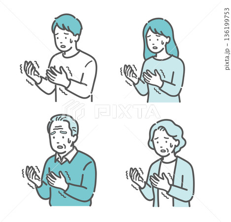 手の痺れ・震えに戸惑う老若男女のイラストセット(糖尿病・脳梗塞・パーキンソン病)
