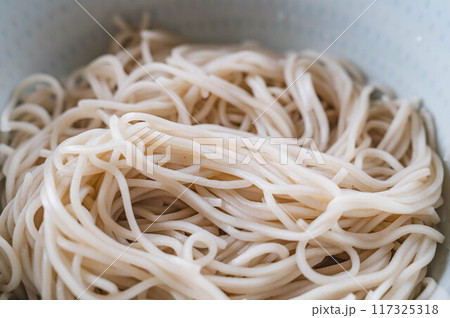 更科そば、更科蕎麦、更科ソバ、さらしな蕎麦。更科粉8割使用の乾麺の白っぽい更科蕎麦。