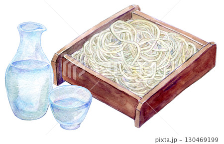 水彩イラスト 老舗蕎麦屋の冷酒と蕎麦