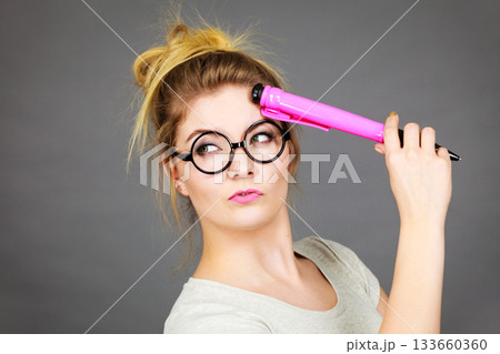 Teenage female student leaning on desk, resting head amid notebook and pen at lecture hall