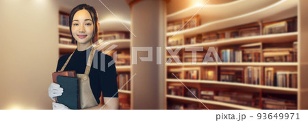 図書館で働く女性と図書イメージ 書店 司書 学芸員 バナー・広告向け横長ビジュアル