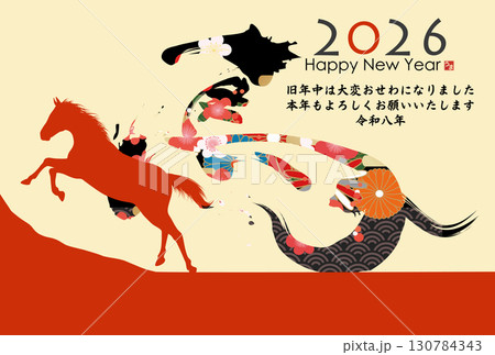 年賀2026 年賀状2026 馬 午 干支 墨絵 水墨画 水彩 手描き シルエット イラスト素材