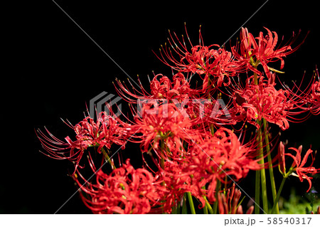 黒い背景と太陽光を浴びる鮮やかな彼岸花
