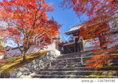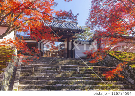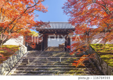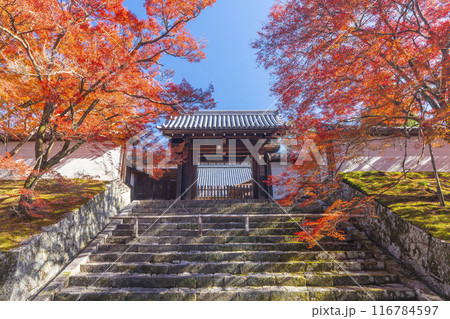 曼殊院 紅葉に包まれた勅使門と石段 京都市