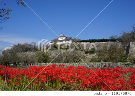 岡山県津山市にあるさくら名所100選のひとつ「鶴山公園(津山城趾)」:彼岸花の咲く風景