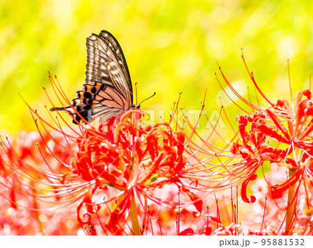 赤い彼岸花の蜜を吸うアゲハ蝶