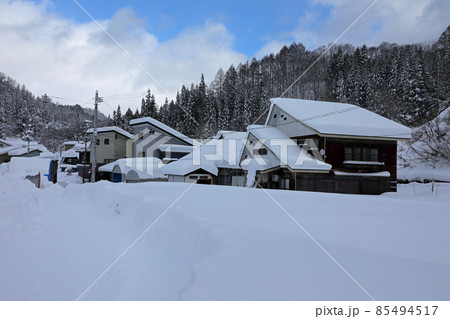 最奥の集落に雪積もる、青空と白い雲 福島県只見町